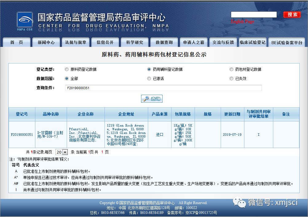 Pfanstiehl拳頭產(chǎn)品之一,D-甘露醇(M-109-7)CDE登記號(hào)F20190000351已在CDE網(wǎng)站公布: